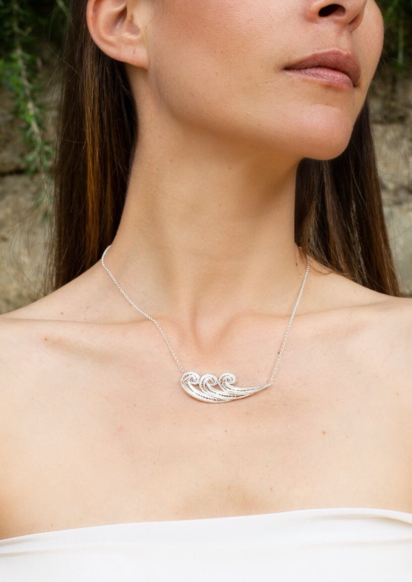 INFOThe ONDE necklace, light and comfortable, is inspired by the movement and lightness of the water. The filigree in it is composed of very thin silver threads, that underline the idea of the jewel movement and transparency.