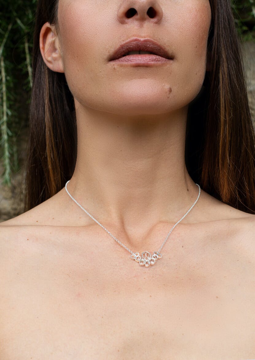 INFOThe organic composition of this piece reveals in each cell a different shape of handwoven threads, embellished with small spheres of pure silver. The lightness and transparency are part of its nature.