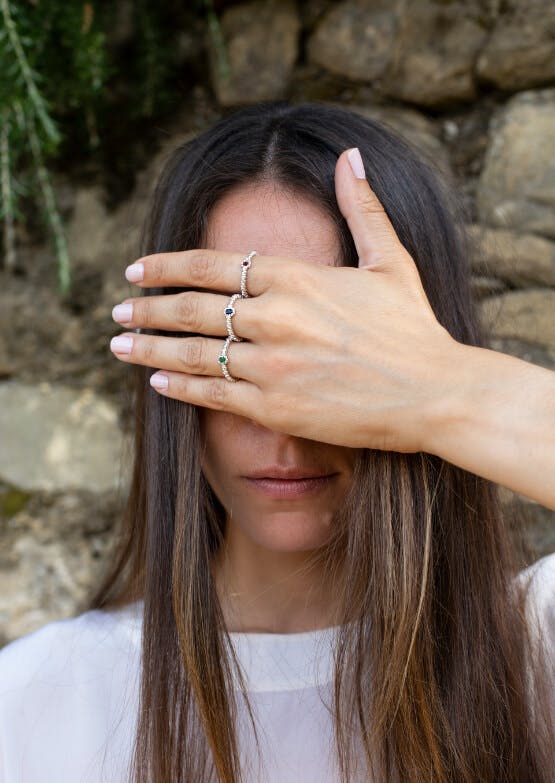 INFOThis ring is the result of weaving several silver wires, that contain a wonderful green emerald in the centre. Perfect to mix and match with the other plaited rings, whether silver or gold.